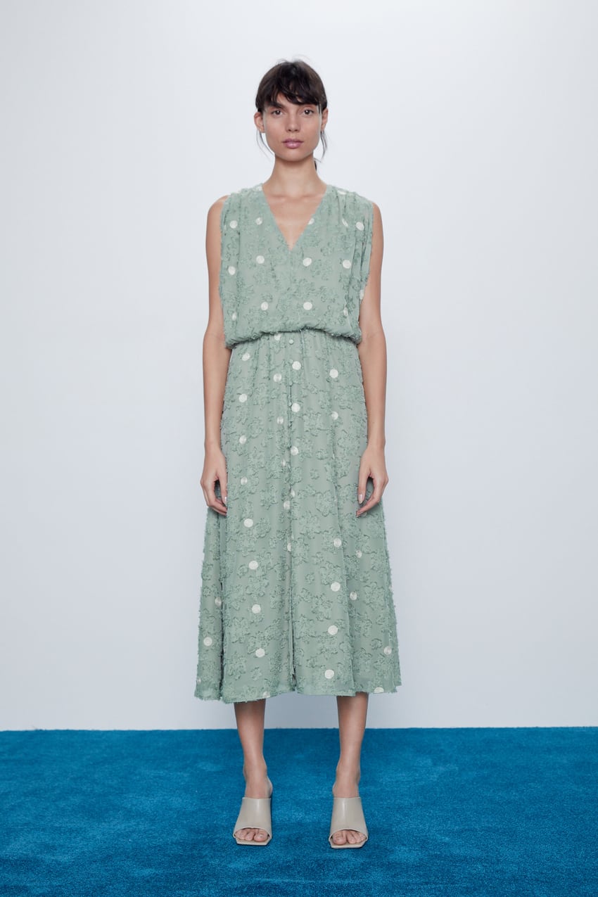 Otro midi que volará de las estanterías de Zara gracias a su precio es este vestido de estructura disponible en verde y con detalles en crudo. En este caso, al tan favorecedor largo midi se le une una manga con sisa amplia que lo hace una opción muy fresquita para esos días de eterno calor. Tiene la cintura elástica y un tejido combinado a contraste con botones en la parte delantera. El color verde sienta igual de bien a las pieles morenas y a las menos bronceadas y los topos crema le dan un toque divertido a la prenda.