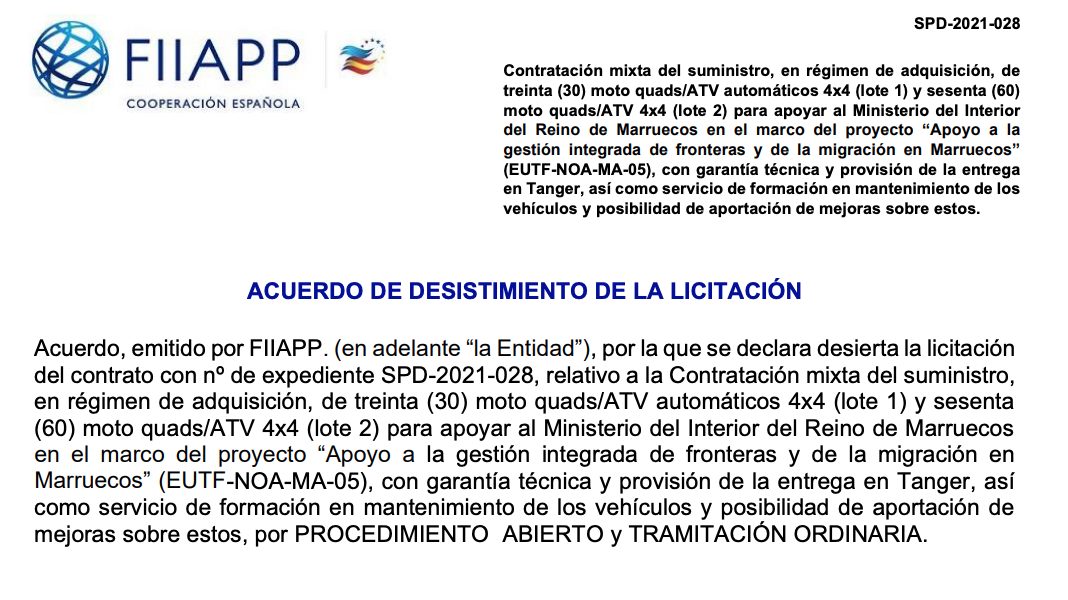 La Fundación Internacional y para Iberoamérica de Administración y Políticas Públicas ha decidido directamente «desistir de la adjudicación de la licitación de referencia» para no volver a ponerla sobre la mesa. Según aclaran desde el Gobierno, esa adjudicación presentada en marzo de 2021 ha estado completamente «desierta», razón por la que, de cara a la galería, han frenado en seco la adjudicación de estos quads. Lo que detallan desde el partido es bien distinto, pues algunos deslizan que simplemente Albares ha querido poner fin a esta política de entrega constante de regalos a las fuerzas de seguridad de Marruecos dado que de poco sirvieron a la hora de controlar a los inmigrantes ilegales que «invadieron» Ceuta después de que la ministra Arancha González Laya se empeñara en acoger a escondidas al líder militar del Frente Polisario Brahim Ghali. Lo que quiere el titular de Exteriores es acabar con la política seguida por Laya que en tantos problemas ha metido a España.