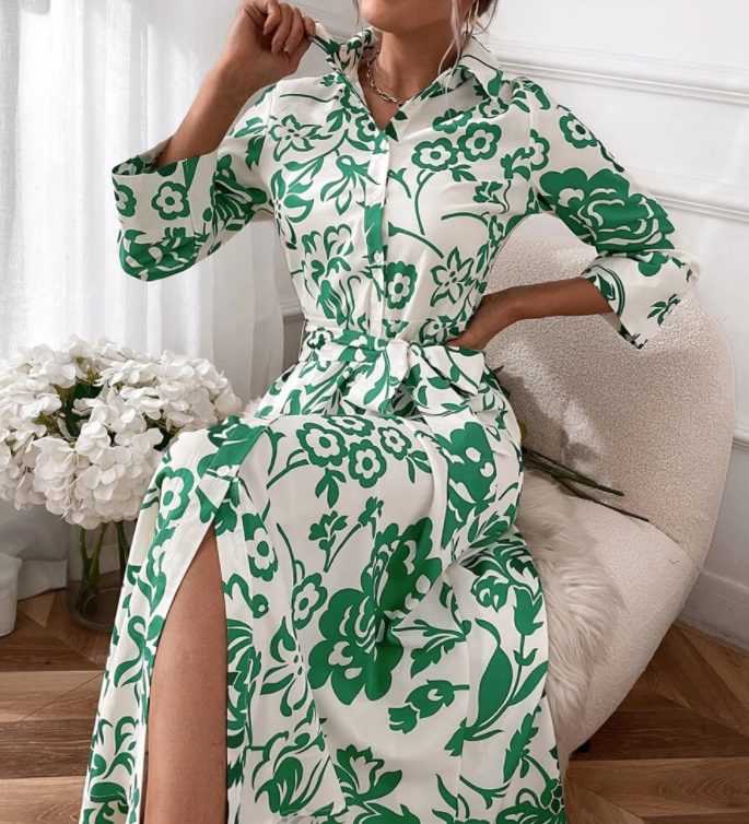 Opciones de vestidos en Shein hay muchas pero pocas tan elegantes y sofisticadas como este vestido largo y camisero. Hablamos de una pieza de base en tono blanco que llama la atención por contar con un bonito estampado de flores en un color verde de lo más vibrante.