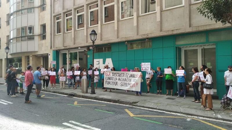 La Plataforma Bizitza se ha concentrado este viernes ante las sedes de ELA de Bilbao y San Sebastián para denunciar que la vacunación obligatoria es «una actitud contraria a los derechos fundamentales, además de ir en contra de todas las leyes en vigor», tras el posicionamiento del sindicato «claramente a favor de obligar, contra toda norma y derecho legal actual, a vacunar a toda la población y también a cambiar la ley para obligar al personal de las residencias a obligarles a vacunarse contra su voluntad».