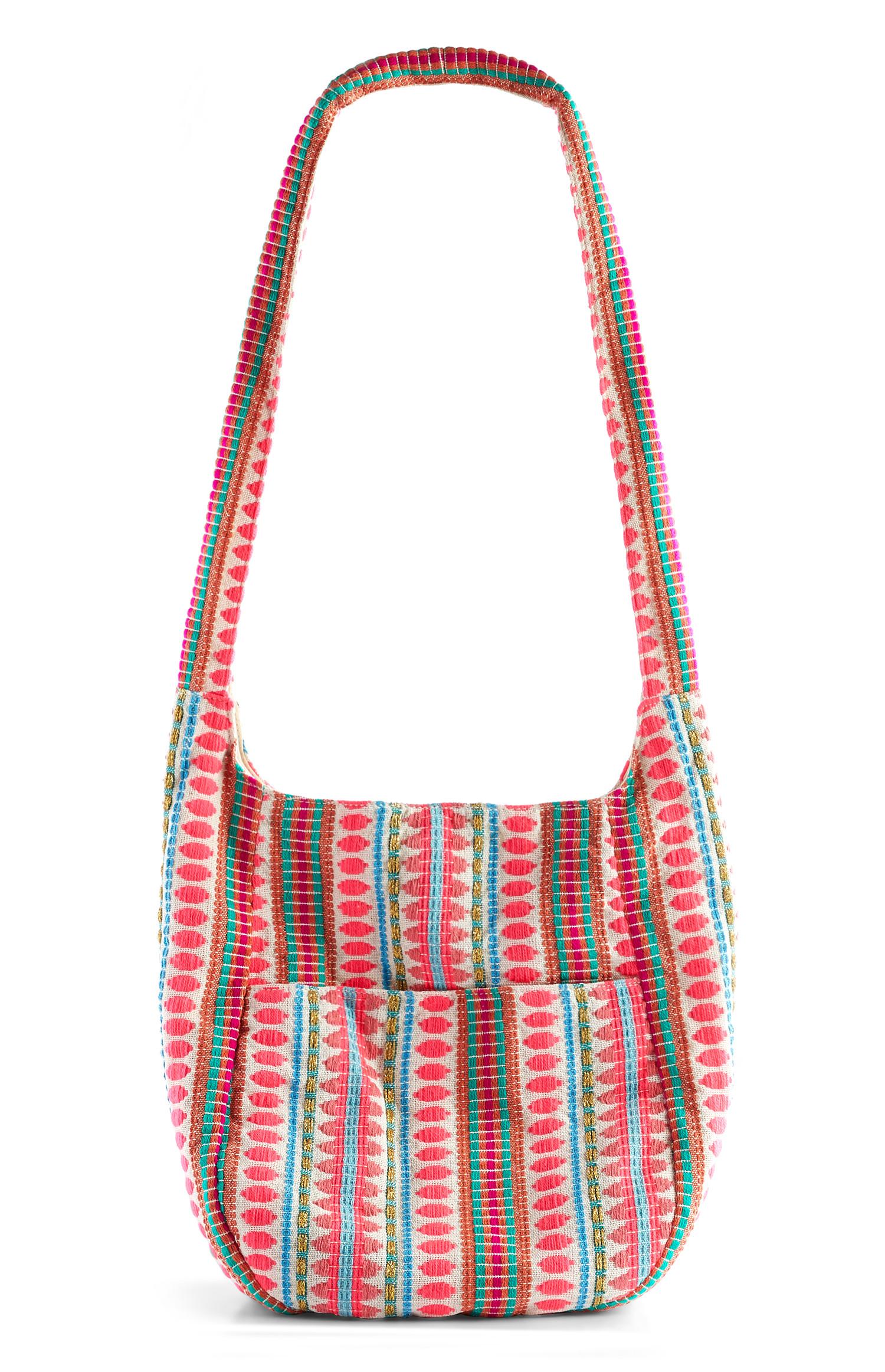 Pues, parece que Primark se supera con este bonito bolso estampado tricolor. Con juegos en líneas y estampados en colores rosa chicle, azul aguamarina, y pequeñas franjas de marrones y verdes, este bolso nos ha convencido del todo. Muy fácil de llevar y con un amplio bolsillo extra en la parte exterior, este complemento puede ser tuyo por ¡6 euros!