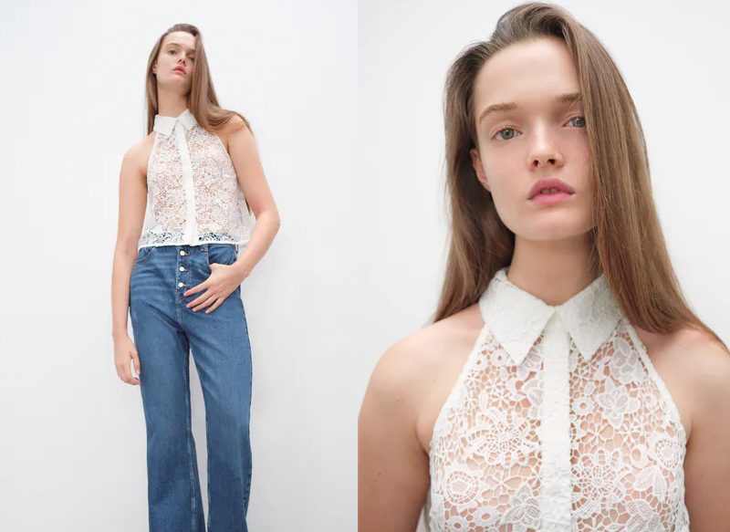 Zara tiene en su catálogo este top crochet, un modelo semitransparente de cuello solapa y manga sisa, el cual posee un cierre frontal con botones. Es un artículo que no incluye forro en su interior y que se encuentra a la venta por 25,95 euros. Está a la venta en tallas XS a L.