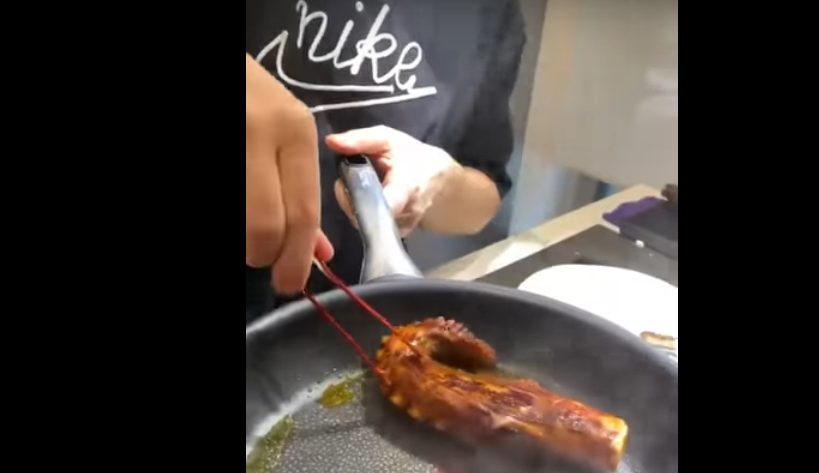 Por último, hay que embadurnar las patas con la salsa mojo Nikkei de Dabiz Muñoz. Una vez hecho eso, se ponen en una sartén o plancha para hacerlas. Es importante que se quede algo tostado por el exterior. Aunque no necesitará demasiado tiempo para hacerse por dentro, ya que estaba previamente cocido. Una vez hecho ese paso, se aparta el pulpo dorado y se corta en rodajas gruesas.