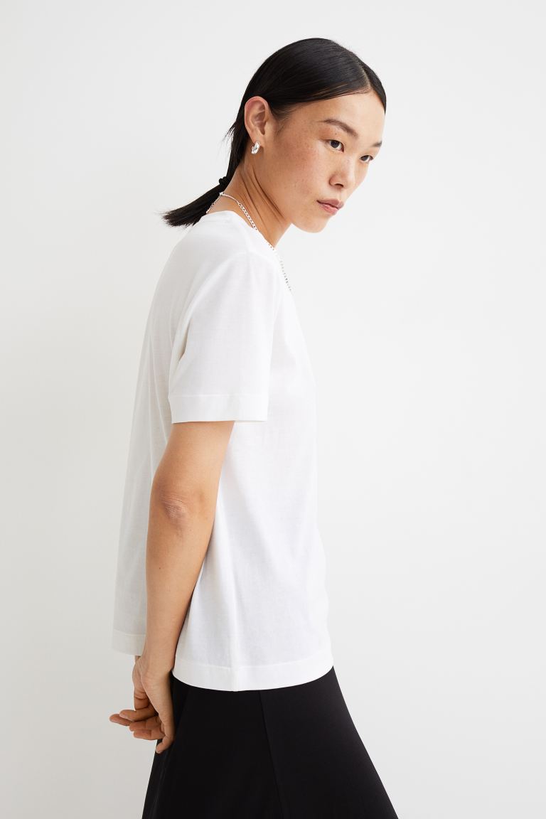 Es una hermosa camiseta elaborada en 50% de seda y un 50% de algodón, por lo que es una de las más vendidas por la plataforma. Dado que ofrece una gran variedad de colores y, sobre todo, son perfectas para usar en cualquier ocasión. Cuenta con un diseño de puntos fluidos suave de seda y completamente de algodón. Tiene un modelo recto con mangas completamente cortas, dándole un toque increíble para ser uno de los modelos más sencillos. Entonces, si quieres comprar esta camiseta solo debes entrar en H&M por un precio de 29,99 €.