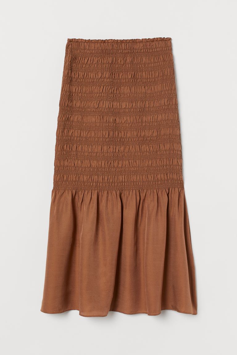 Esta hermosa falda midi se caracteriza por estar confeccionada en seda con una salga ligera fluida, con una mezcla de lyocell tencel. Además, con que seda permitiendo cambiar de color según la proyección que tenga la luz. Cuenta con una cintura ancha con un elástico oculto, es fruncido en la parte superior y con una sección completamente acampanada desde las rodillas. Inclusive, no tiene ningún forro en su parte interior, por lo que es aún más cómoda. Entonces, si la deseas comprar solo debes entrar a H&M a un cómodo precio de 59,99 €.