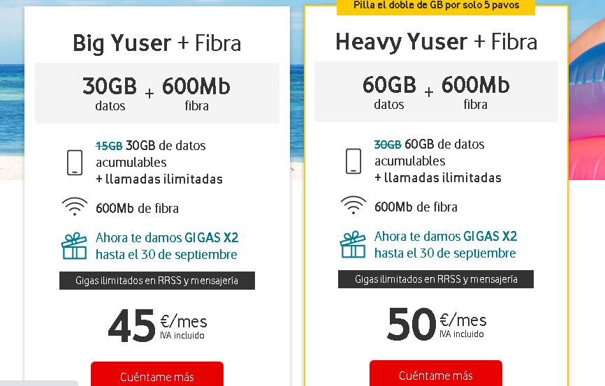 Vodafone comenzó su promoción de ‘vuelta al cole’ con una campaña que incluye descuentos del 50% durante seis meses en sus tarifas de mayor valor y el estreno de la contratación de Disney +. Las ofertas estarán en vigor hasta el 30 de septiembre para nuevos clientes o usuarios que solo tengan móvil o fijo y mejoren sus paquetes. Las ofertas para particulares varían de un precio de 50 euros al mes (con el descuento) a 62,5 euros al mes en función de las líneas incluidas, mientras que las ofertas para negocio cuentan con precios de de 50 euros al mes hasta 57,5 euros al mes.