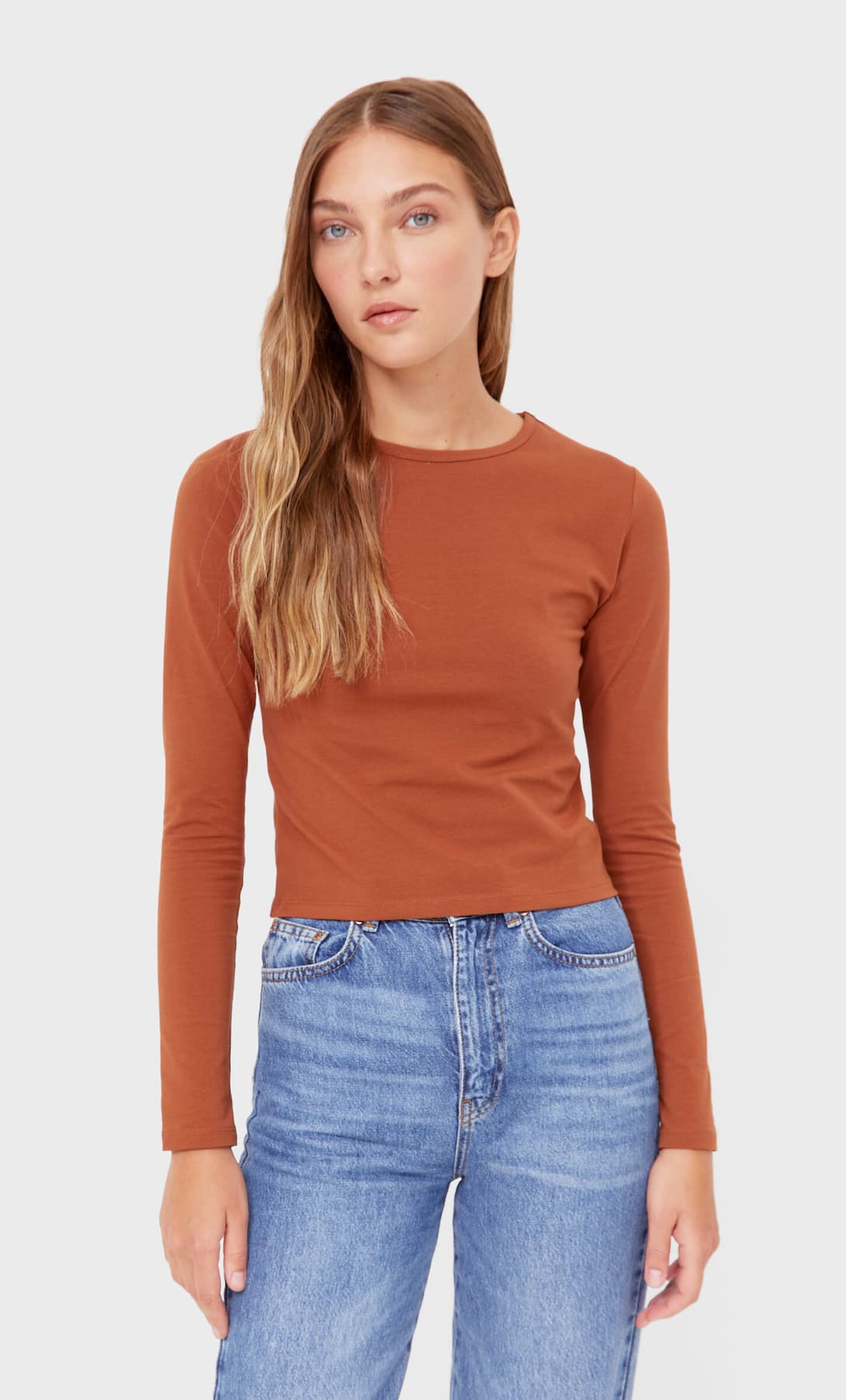 Por eso, una de las que más nos ha llamado la atención es esta camiseta cropped de manga larga de Stradivarius en un atractivo color teja. Por tan solo 7,99 euros, será una prenda todoterreno que usar en cualquier ocasión.