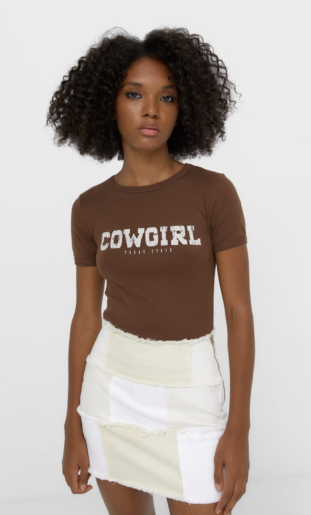 Las camisetas con mensaje que causaron furor en los 90s también comenzaron a volver a las tiendas en la pasada temporada. Ahora, una de las más vendidas es esta, de Stradivarius, donde podemos leer en letras blancas y grandes: «Cowgirl».