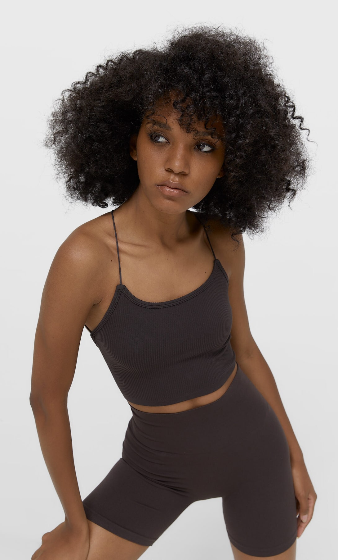 Otro top que no puede faltar en esta selección de Stradivarius es este en color marrón chocolate. También de corte básico, llama la atención por sus tirantes de espagueti así como por su espalda, que hace bonitoss cruces de fantasía.
