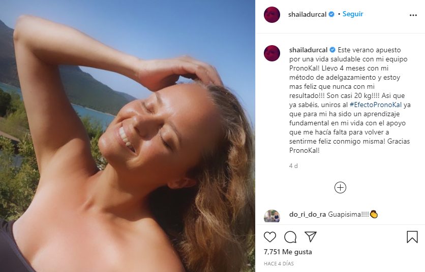 Como no podía ser de otra forma, Shaila Dúrcal, que mañana cumplirá 42 años y ha vuelto a vivir a España desde México, aprovechaba su Instagram para compartir el logro y la felicidad que le suponía. «Este verano apuesto por una vida saludable con mi equipo PronoKal! Llevo 4 meses con mi método de adelgazamiento y estoy más feliz que nunca con mi resultado!!! Son casi 20 kg!!!!», escribía en su cuenta.