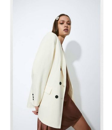 En blanco puedes tener esta americana con solapa, con manga larga y hombros marcados. Bolsillos delanteros con tapeta. Como puedes ver a la modelo, lleva un cierre frontal cruzado con botones y más botones en el puño. Su precio es de 35,99 euros, pero date prisa porque pronto subirán de precio. Sin duda, la mejor prenda para lucir durante este otoño.