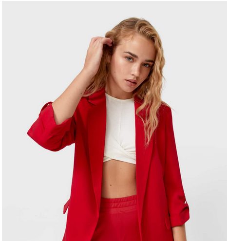 El repertorio de Stradivarius es muy amplio y podemos también encontrar una chaqueta americana de manga remangada. En este caso con solapa, manga 3/4 acabada en vuelta con trabilla. Viene con hombros marcados y unos bolsillos delanteros con tapeta. El precio es de 29.99 euros y lo tienes en tres colores: rojo, piedra y negro. Date prisa porque te puedes quedar sin ella.