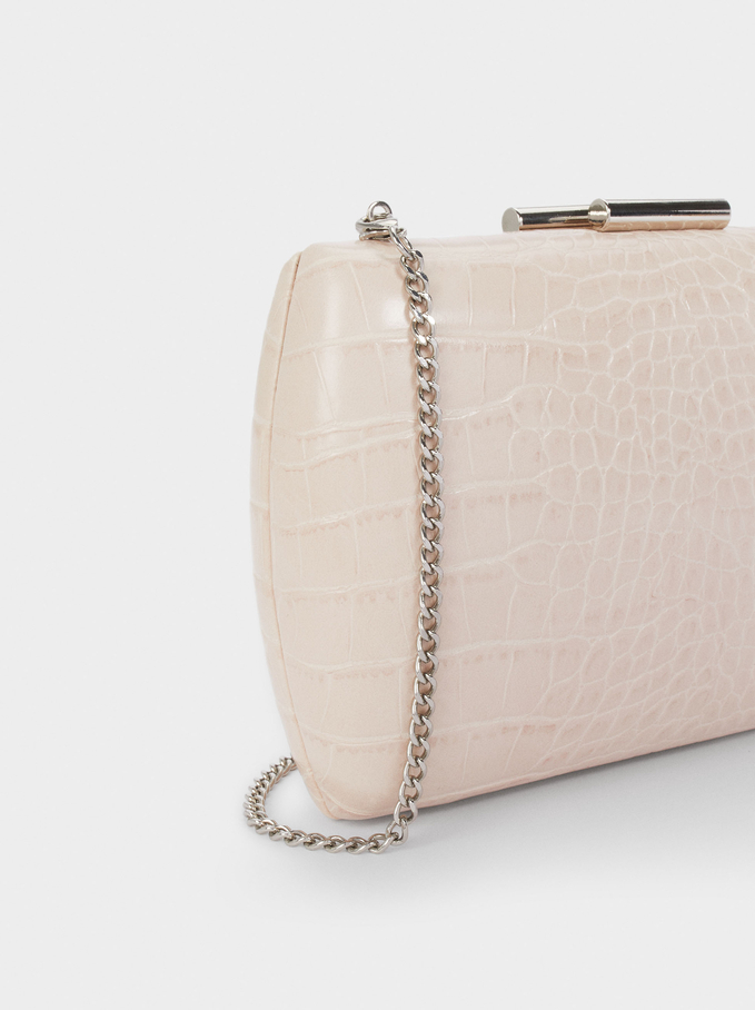 Delicado, fino, elegante, con una delicada cadena para llevarlo sobre tu hombro, su interior forrado donde cómodamente puedes colocar lo que requieras guardar. En un delicado color rosa y podrá ser tuyo por 17.99 euros.