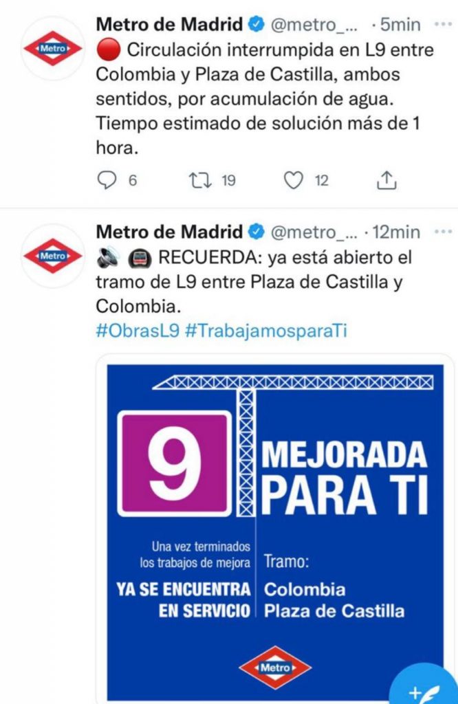 «Mejorada para ti», con este claim el departamento dirigido por Miguel Oliver anunciaba la reapertura de las estaciones que han permanecido cerradas durante semanas para someterse a obras de modernización. Los viajeros esperaban con ansía la reapertura pero se han visto con la línea paralizada, la estación inundada y sin servicio especial de autobuses sustitutivos. Sin embargo, las redes sociales de Metro no han dudado en mandar su mensaje de #TrabajamosparaTi para anunciar que ya se encontraba en servicio la estación.