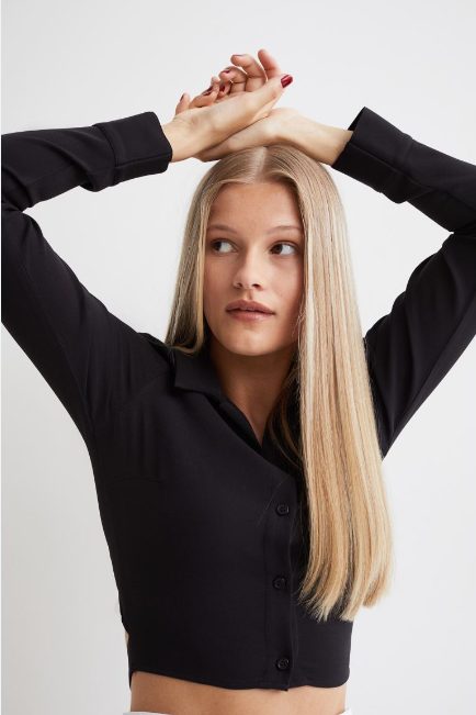 Si quieres lucir joven, conservando toda tu elegancia y glamour, tienes que buscar en las tiendas H&M, esta delicada blusa con lazada. Una prenda de talle corto, cuello clásico, en sarga ligera y una delicada y preciosa abertura con lazada debajo de la espalda.