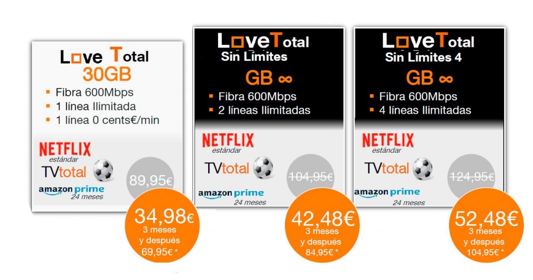Orange también da la opción de ver el fútbol junto a Netflix. En este caso hay que contratar la Love Total Plus donde tienes todo el fútbol, cine, series, Netflix HD y más de 80 canales junto con una línea de fibra de 1 Gbps y dos líneas móviles con datos ilimitados por 85 euros durante 6 meses y luego 110 euros al mes. Además de Amazon Prime durante 12 meses.