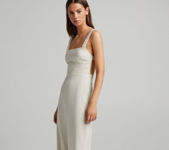 Hoy te estamos mostrando ropa bonita y barata, y en esta ocasión también muy elegante. Aquí tienes un mono largo tirantes fruncidos con lino que nos parece ideal para llevar a la oficina o para lucir durante los fines de semana. Y de esta a 29.99 euros, ahora se encuentra más barato que nunca a 17,99 euros. Lo tienes en colores arena y azul claro. Hemos mirado y no creemos que puedas encontrar algo igual en Stradivarius. ´
