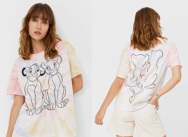 Una última recomendación es esta camiseta Rey León tie dye, una camiseta de cuello redondo y manga corta que cuenta con un detalle de estampación en frontal y trasero. De esta forma se puede ver la parte delantera y trasera de Simba y Nala de «El Rey León», dos personajes históricos de Disney.
