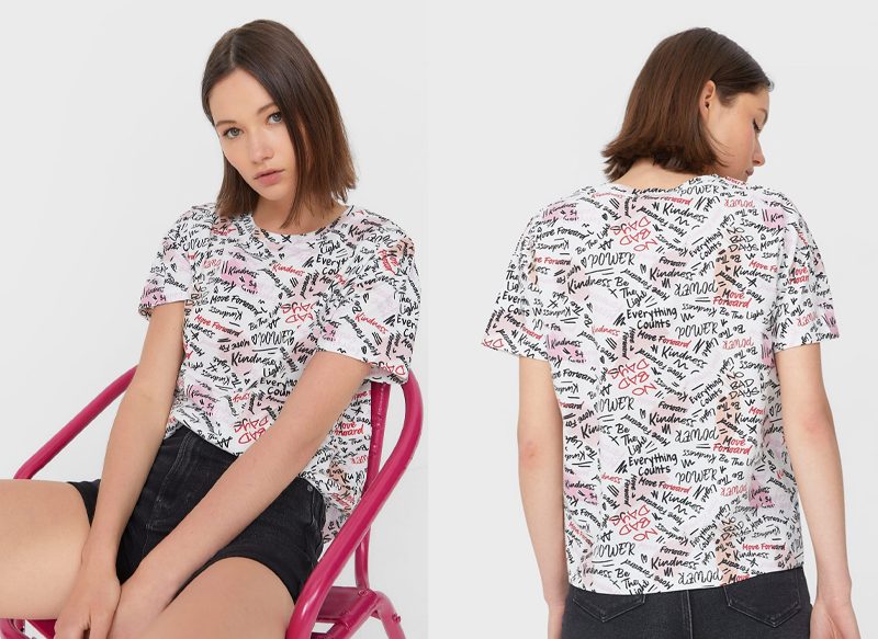 Stradivarius tiene en su catálogo esta camiseta estampada muy original que banco un fondo claro se encuentra con un estampado llena de diferentes frases. Esto hace que sea un diseño diferente al habitual, pudiendo dar así un toque especial a tus looks. Está a la venta por 7,99 euros.