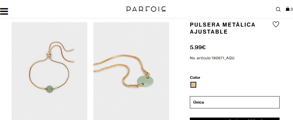 Es una pulsera completamente metálica e inclusive se puede ajustar como lo desee la mujer que la compre. Cuenta con un hermoso diseño en la parte del centro, para darle ese toque que cualquier mujer espera en sus joyas. Inclusive, es perfecta para usar en esos días que no deseen ir recargadas de joyas, ya que esta genera un toque llamativo a su prenda. Esta es fabricada con un 70% de latón, un 10% de esmalte, 10% de hierro y un 10% de zinc. Entonces, si deseas comprar esta pulsera metálica ajustable solo debes entrar a Parfois a un precio de 5.99€.