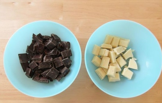Esto es lo que vamos a necesitar para hacer Huevos Kinder caseros. Unos 200 g de manteca de cacao (en farmacias, para postres de este tipo o turrones de chocolate es lo mejor), 150 g de chocolate de cobertura troceado, 150 g de chocolate de cobertura blanco troceado, tres cucharadas de mil, una pizca de sal y Lacasitos de colores o M&m´s . Como utensilio un molde para huevos, al estilo de los que se usan en tiempos de Pascua. Y ahora nos ponemos manos a la obra.