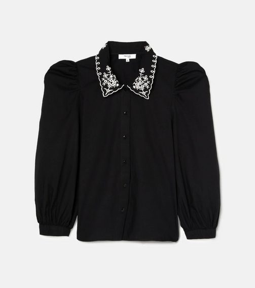 Las blusas negras son un básico en el armario, ya que nos pueden resolver infinidad de situaciones estilísticas. Y si encima elegimos una con un diseño un poco especial, mucho mejor. Esta de Fórmula Joven de El Corte Inglés tiene unas bonitas mangas francesas abullonadas y un llamativo detalle de bordados a contraste en el cuello. Confeccionada en popelín de algodón es una prenda que combinará con todos tus looks y con la que marcarás estilo en cualquier lugar y situación. Tiene un recio de 35,99 € y este es el link directo.