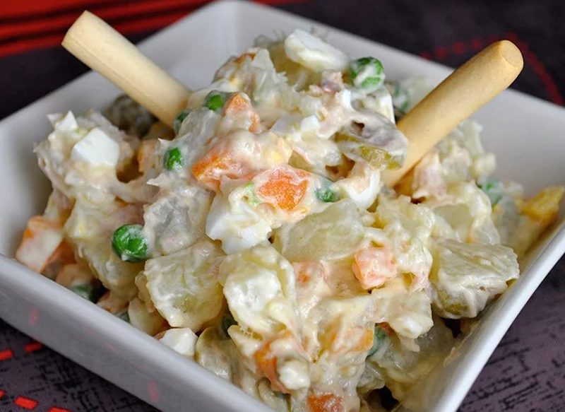 La ensaladilla rusa es un plato de verano que se elabora a base de patatas y otras verduras, mezclado con mayonesa; y con la posibilidad de poder decorar la misma con aceitunas, pimientos y otros ingredientes.