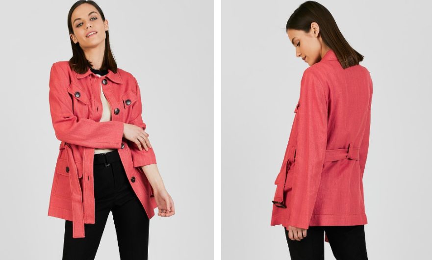 Vamos con otro modelo sofisticado y donde lucirás este otoño a la última moda. Toca ahora esta chaqueta de mujer sahariana de cuello con solapa y disponible en color rojo, como en la foto. Tiene un descuentazo en El Corte Inglés del 55% y se queda en 39,99 euros. Lleva el cuello solapa, falsos bolsillos en pecho y bolsillos en bajo, además de botones a contraste y cinturón ajustable. Está fabricado un 67% en viscosa y el resto en lino. En este enlace la puedes adquirir.
