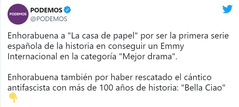 Sin embargo, una de las cosas que más llamó la atención fue que el partido político Podemos, quiso hacer una especial mención a la utilización del «Bella Ciao» por parte de la serie como himno antifascista. Todo un logro.