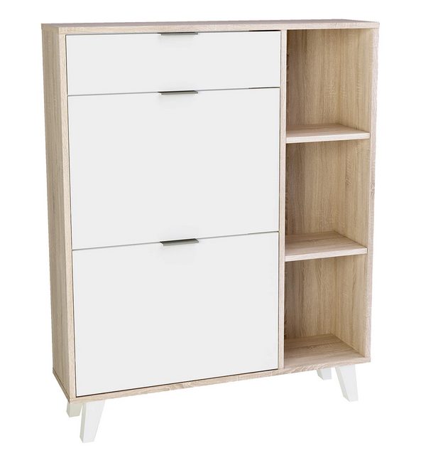 Este zapatero de la marca Meka Block es especialmente completo, ya que cuenta con 2 trampones con puertas pivotantes con capacidad para unos 12 pares de zapatos. También dispone de un cajón superior con tiradores metálicos para guardar accesorios y un estante con tres compartimentos en un lateral, para detalles decorativos u objetos pequeños, CD’s, etc. Es de melamina bicolor, en blanco y efecto madera, y se instala anulado a la pared. Tiene cuatro patas en color blanco y unas medidas de 90 (ancho) x 25 (fondo) x 112 (alto) cm. Su precio en El Corte Inglés es de 129€ y lo puedes comprar en la tienda online.