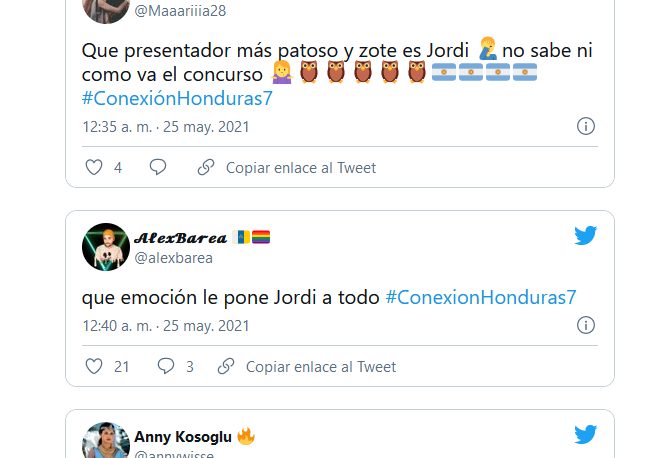 “¿Podéis despedirlo ya por favor?”, fueron las palabras dedicadas por uno de los espectadores. “Jordi fuera ya. Q presentador más malo. #ConexionHonduras7”, dijo otra. Alguno incluso fue más allá con un “Jordi, eres tan gran presentador y te apasiona tanto tu trabajo que no sabes ni lo que ha tocado a cada uno, eres un inútil. #ConexiónHonduras7”. La verdad es que si usas el hashtag #ConexiónHonduras7 vas a encontrar muchos más comentarios.