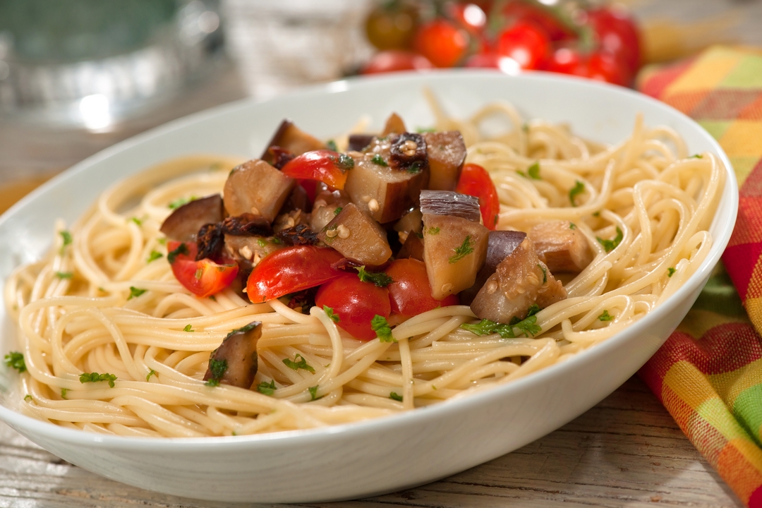 La pasta es uno de los alimentos más utilizados en las dietas vegetarianas. Si quieres aportarle además una buena cantidad de nutrientes y un sabor exquisito, debes probar a añadir berenjena.
