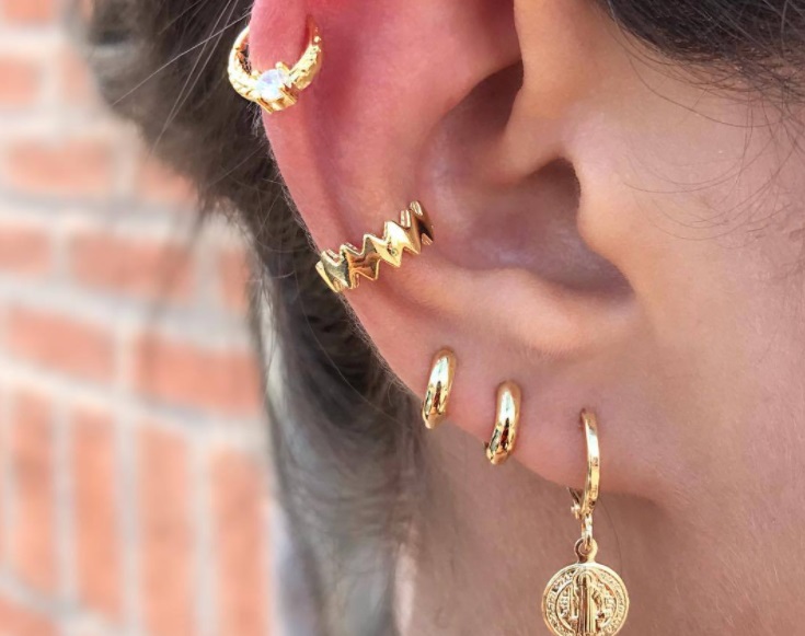 Si no quieres tener dudas, nada como hacerte con un pack completo de pendientes. Sobre todo cuando tienes varios agujeros a lo largo de la oreja además del clásico del lóbulo. En este caso optamos por la opción de un acabado en dorado que siempre nos aportará el toque más actual.