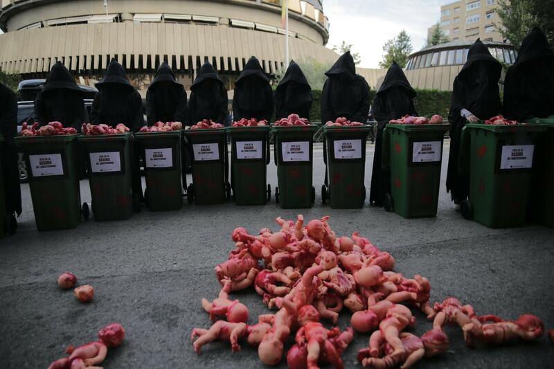 Los congregados ante el Alto Tribunal han procesionado con cubos de basura y han dejado a las puertas del TC decenas de muñecos ensangrentados con los que querían representar los abortos que se realizan en España que, según la asociación, ascienden a 1,1 millones desde 2010. Asimismo, los voluntarios han coreado lemas como ‘No más silencio’ o ‘Legal o ilegal, el aborto mata igual’.