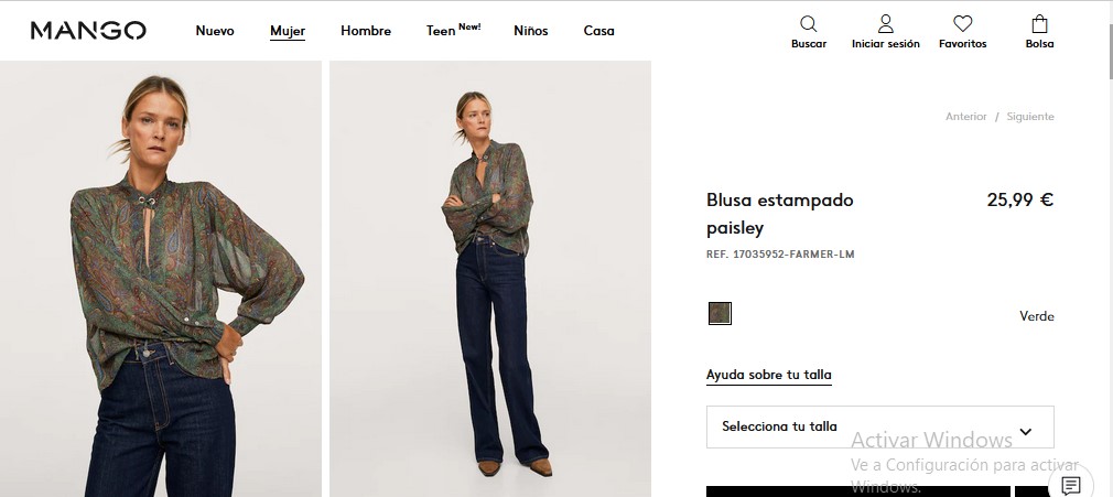 Es una blusa que cuenta con un tejido ligero, y un estampado paisley con un diseño recto. Cuenta con un cuello de pico ajustable con cordón y es de manga larga abullonada. Por lo que, se considera otra de las prendas perfectas para usar en la temporada de otoño. Dado que es super cómoda para usar en cualquier reunión o evento del día. Si te animas a comprarla solo debes entrar a Mango a un precio accesible de 25,99 €.