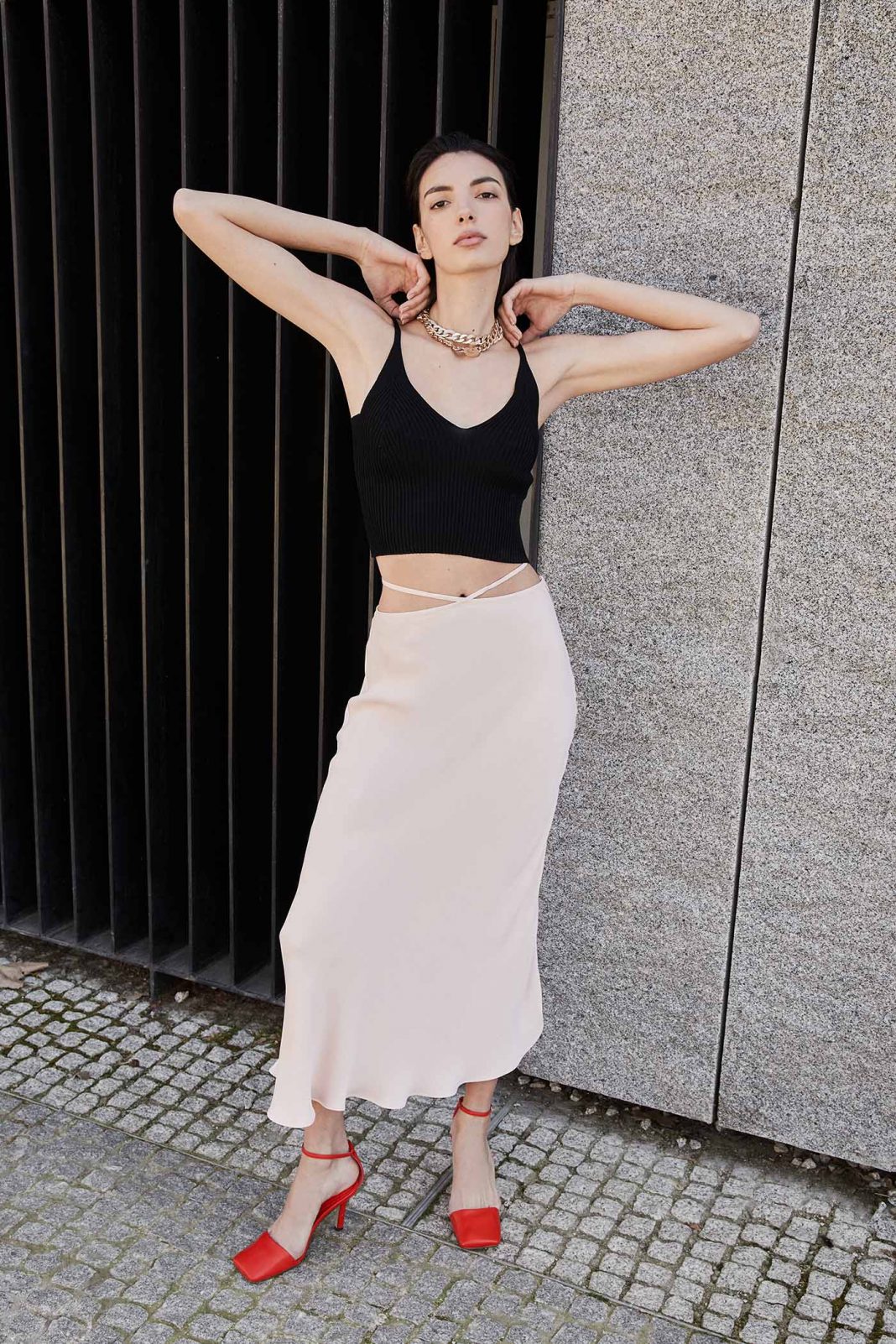 En primer lugar Sfera trae una falda MIDI lencera con tiras combinadas a tono en la cintura. Esta prenda es perfecta para llevar en cualquier ocasión, debido a su diseño y color, además que combina con casi cualquier conjunto. Esta increíble falda puede ser tuya en cualquier tienda física por el precio de 11.99 euros.