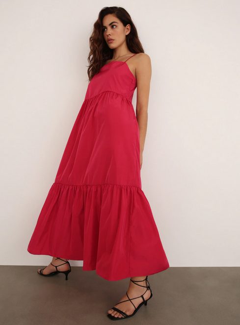 La marca Fórmula Joven nos ofrece este llamativo vestido largo de tirantes en color fucsia con lazada en la espalda, cierre de cremallera en un lado y forma de volante en el bajo. Está fabricado en tejido de tafeta con un original efecto brillante, que le da un toque muy femenino y elegante. Muy versátil, ideal si se combina con sandalias de tacón para un look especial, y también para outfits más otoñales, combinado con una chaqueta bonita. Con el descuento de El Corte Inglés del 70% se queda en 23,99€. Este es el link para conseguirlo.