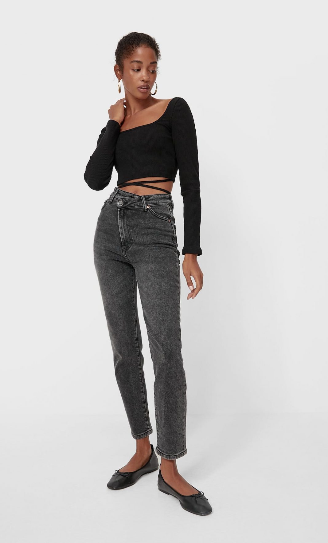 Un pantalón delicado para una figura delicada, así es el Jeans mom fit cintura asimétrica que tienen para ti las tiendas Stradivarius. Con un diseño exclusivo donde resalta el detalle de cintura asimétrica junto con su tiro alto y cinco bolsillos.