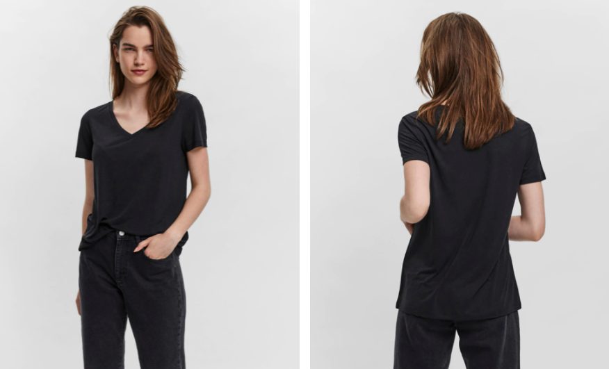 Comenzamos con esta sencilla y minimalista camiseta que puede lucir tanto de manera casual como para un atuendo sobrio, como el caso de la foto, combinado con un vaquero negro. Hablamos de esta camiseta Vero Moda en manga corta y cuello de pico que también la puedes comprar en fucsia o verde anticuario.