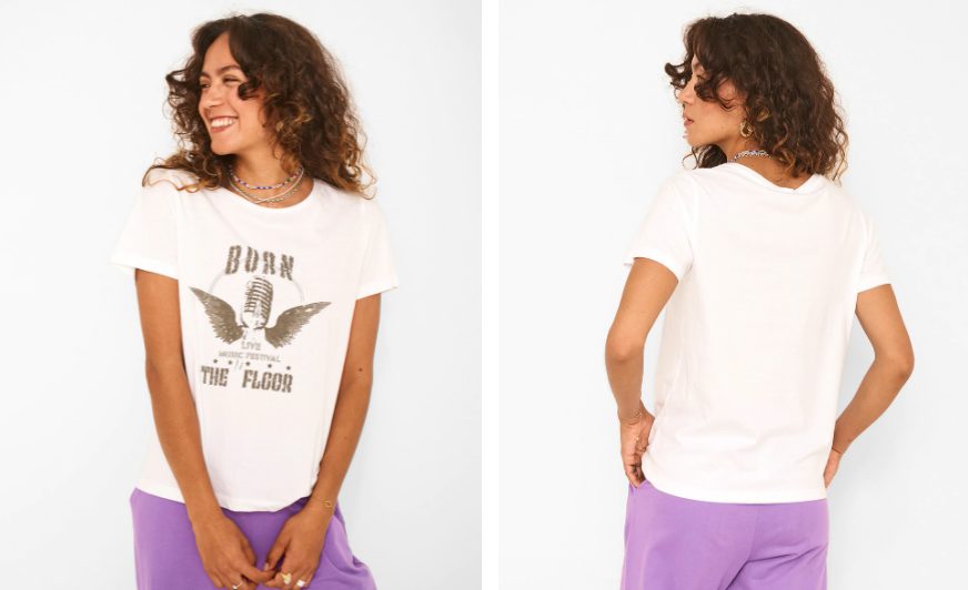 Como ves, tiene un bonito estampado que la hace una camiseta juvenil y fresca, ideal para combinar con vaqueros. Puedes comprarla en negro o blanco. Además está hecha también 100% en algodón, con lo que es de lo más suave y cómoda. Aquí la puedes adquirir.