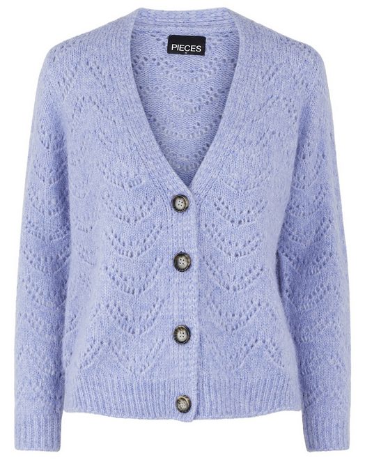 Los cárdigan son prendas perfectas para el entretiempo, que se pueden combinar con mucho estilo con prácticamente cualquier tipo de look. Este de la marca Pieces es de manga larga, con cuello pico y un tejido con efecto calado. Cierra con botones en la parte delantera y es de color morado claro. Tiene un 5% de lana de alpaca, lo que le aporta un extra de calidez. Tiene un precio de 44,99€ y el link para comprarlo es este.