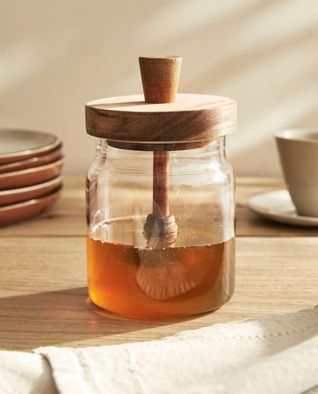 La miel era de borosilicato que tienen en sus tiendas Zara Home, son especiales, prácticas y cómodas para el uso diario. En color transparente y con su tapa de madera, permiten visualizar en forma clara el color de la miel..