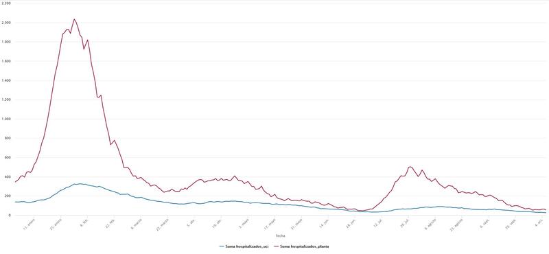 Según la última actualización, los hospitales de la Comunidad albergan 98 pacientes con COVID-19, dos menos que en el anterior parte. De ellos, 28 están hospitalizados en unidades de críticos (UCI), uno menos, mientras que en planta se encuentran ingresados 70, 17 menos.