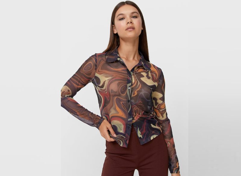 Una de las prendas más interesantes de la nueva colección de la firma de Inditex es esta camisa tul, un modelo en marrón con detalles en otros colores que está disponible en tallas XS a XL por tan solo 12,99 euros.