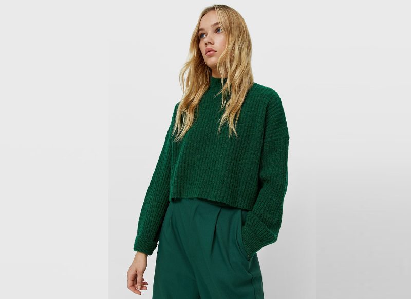 Stradivarius ha lanzado su nuevo jersey crop, un modelo disponible en tallas XS a XL en color verde botella que es perfecto para utilizarlos en tu looks otoñales, una prenda de cuello semicisne y manga larga muy versátil.