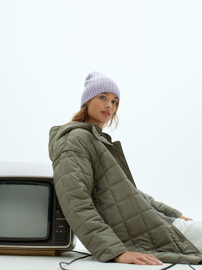 Todo un espectáculo es esta Chaqueta acolchada con Capucha, de las tienda Parfois. Una prenda delicada, elegante de una vistosidad única, su acolchado da una formación perfecta de cuadros en su exterior.