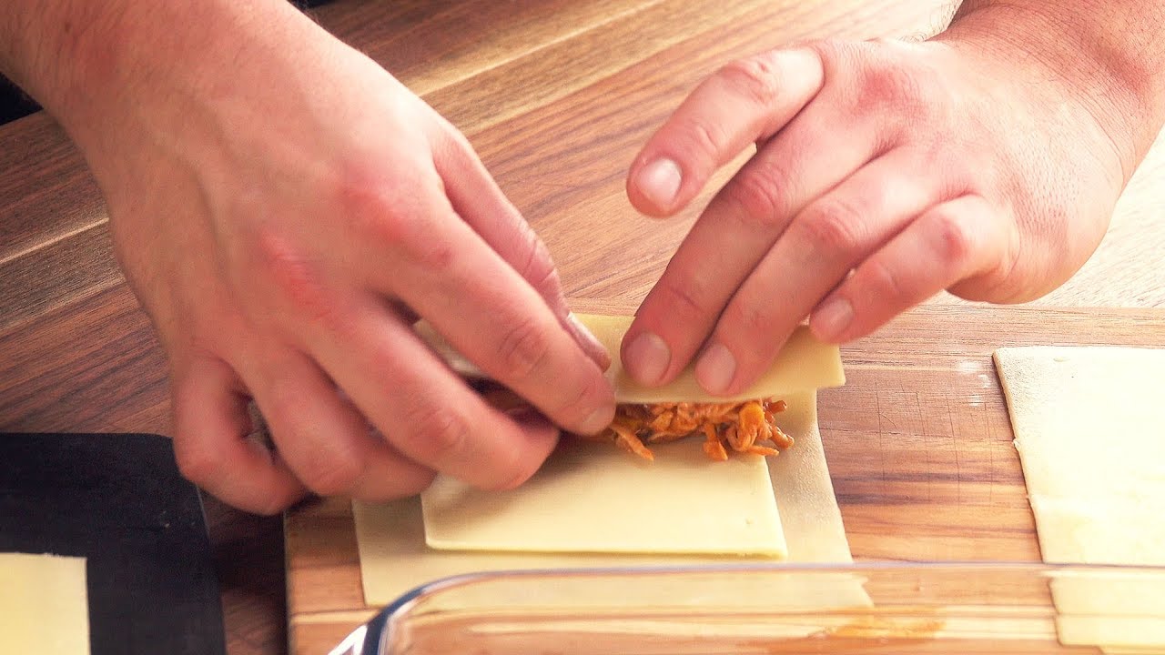 Es el momento de empezar a rellenar las láminas de lasaña con el sofrito frío. Aquí debemos tener cuidado a la hora de doblarlas, ya que se pueden romper con facilidad. Debemos evitar esto a toda costa.