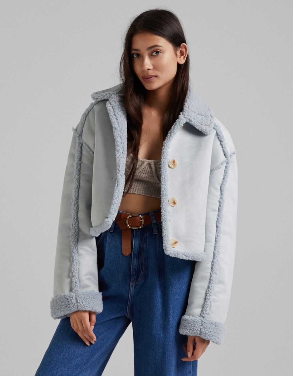 Esta cazadora azul cielo es una de las más bonitas que vamos a encontrar en la sección especial de Bershka. De doble faz y efecto suede, su diseño es uno de los más llamativos.