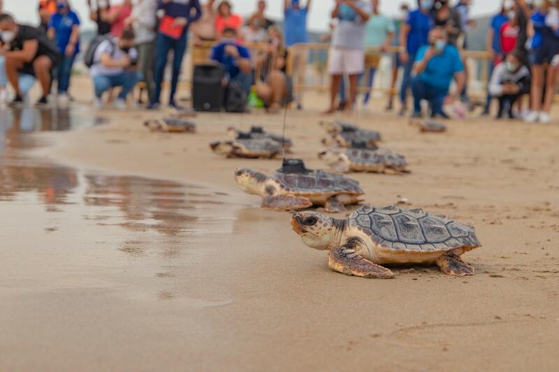 Al acto también han asistido técnicos de la Universitat de València y miembros de la Asociación Xaloc que, junto al equipo de la Fundación Oceanogràfic, también han soltado a las tortugas para que emprendan su viaje hacia el océano.
