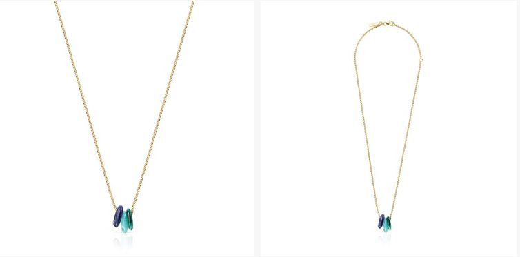 Quieres portar una joya en tu cuello, busca en las tienda Tous este elegante y lujoso Colar de Palta vermeil con malaquita, amazonita y lapislazuli Hold Gems. El tamaño de la cadena es de 45 centímetros y cada colgante es de 1,5 centímetros. Elaborado en Plata de Primera Ley cubierta en oro de 18 Kt.